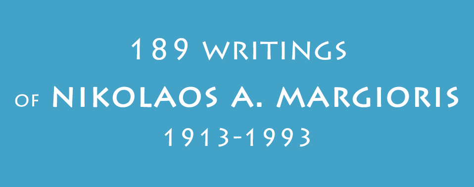 * Introductory note by the biographer: The following biographical summary of Nikolaos A. Margioris, a small part of which was broadcast on television on 16 and 23 February 2009, has been published in the second volume of the three-volume publication by SKAI CHANNEL which is composed of the 100 Great Greeks of All Time as elected by the public in the scope of an open vote that was organized by SKAI CHANNEL in April 2008. It was followed by the circulation of 2 DVDs of the television presentation of the 90 Great Greeks plus 6 DVDs for the first 10, which were released and distributed throughout Greeceas an insert in the newspaper ‘KATHIMERINI’. The television presentation of Nikolaos Margioris is included in the second DVD and his written work of a 1500-word analysis is included in the second volume. He held the 60th place among the 100 Great Greeks of All Time.